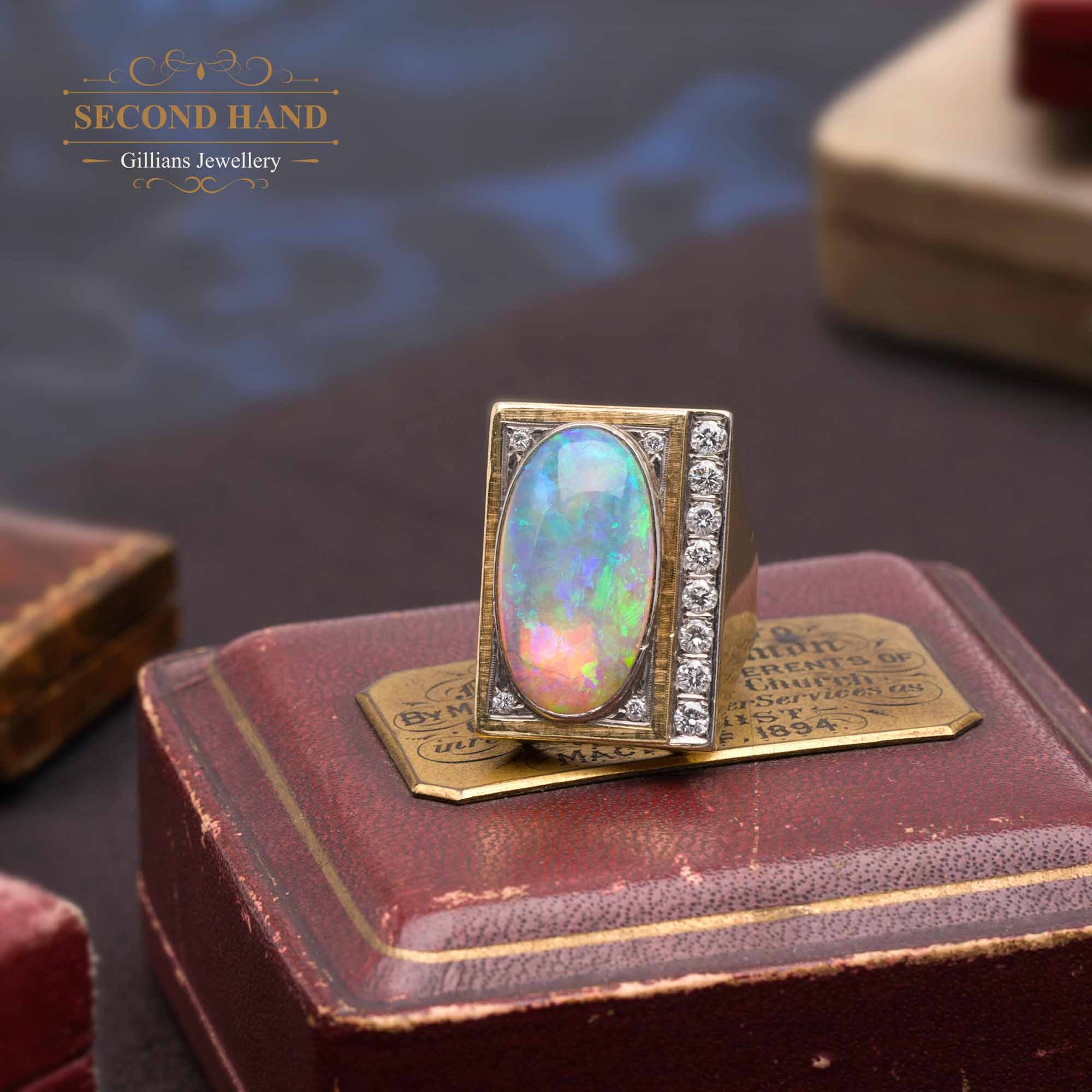 / 18k vintage yellow gold Australian solid white opal and diamonds dress ring
