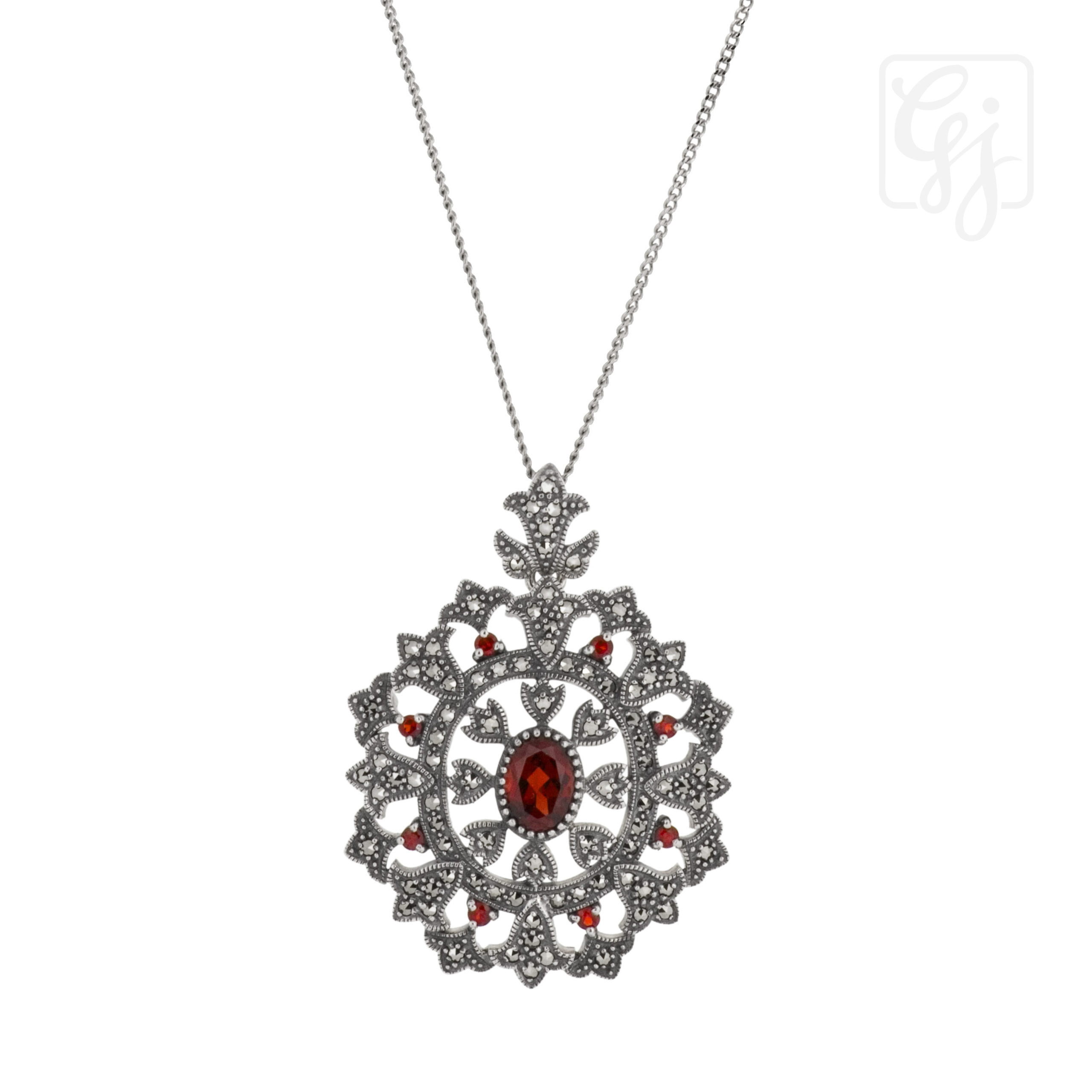 Sterling Silver marcasite and garnet antique style pendant brooch